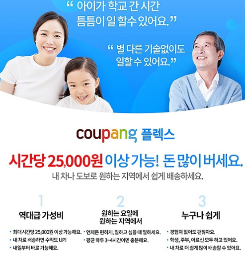주문한지 하루만에 도착하는 로켓배송이 사람들에게 알려지면서 쿠팡의 주문량은 기하급수적으로 늘어났는데요. 늘어난 주문이 많아진 만큼 자연스럽게 배송을 할 수 있는 배송기사분들이 많아져야 겠죠?