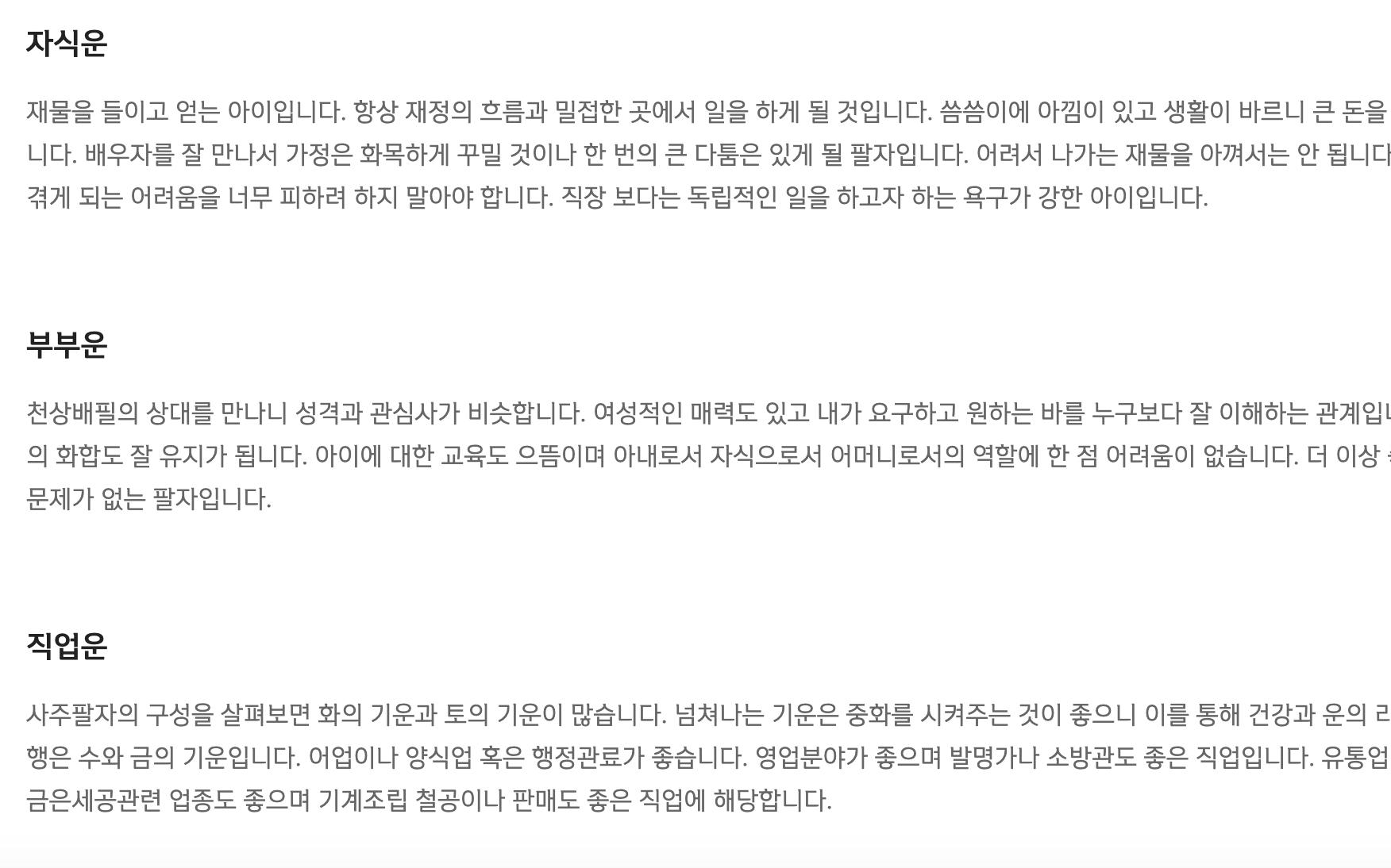 위에 보이는것 처럼 사주정보와 함께 자식운, 직업운 등 다양한 운세 결과가 나옵니다.