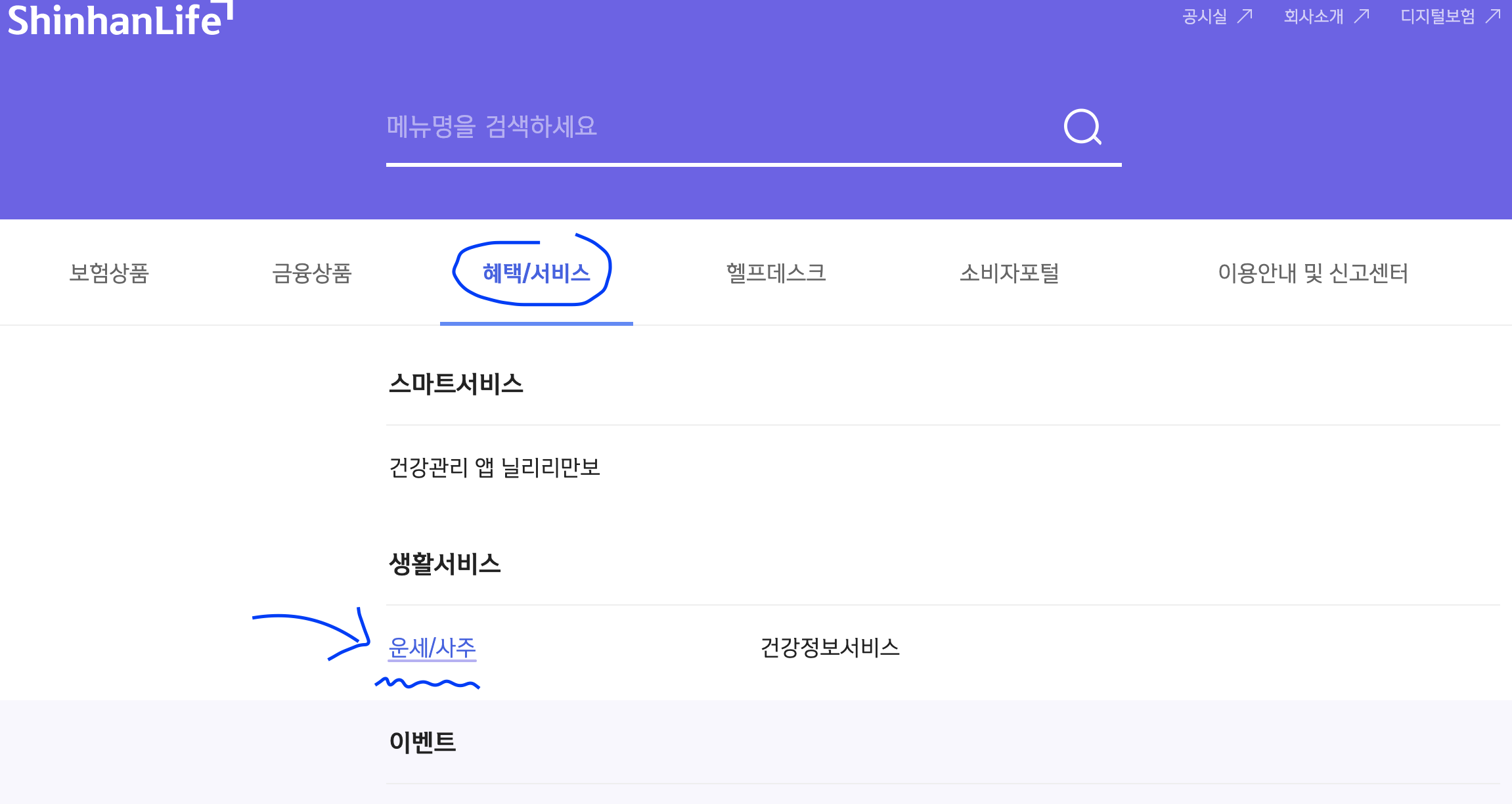 신한생명 홈페이지(신한라이프 홈페이지)에 접속하면 무료운세와 무료사주 서비스를 제공하고 있습니다.