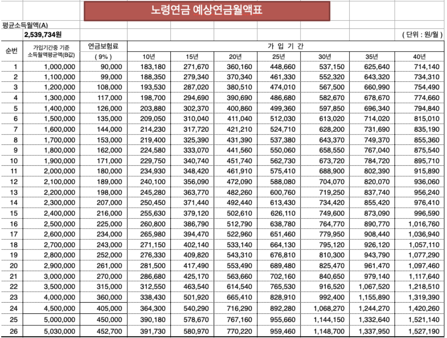 # 국민연금 예상수령액표